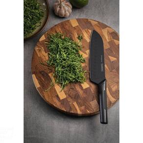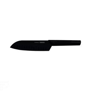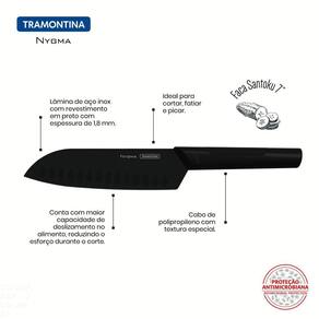 A praticidade que você precisa para tornar o preparo das suas refeições ainda mais versátil, você encontra com a faca santoku Tramontina Nygma com lâmina em aço inox e cabo de polipropileno texturizado preto 7 polegadas. Ideal para cortar, picar e fatiar os mais variados alimentos, ela apresenta lâmina em aço inox com revestimento em preto que garante um excelente fio de corte e cabo de polipropileno que permite um agradável manuseio, já que seu formato anatômico se encaixa perfeitamente à mão. A facilidade e qualidade que faltava na sua cozinha e na palma da sua mão! Orientações Ideal para cortar, fatiar e picar. Lâmina de aço inox com revestimento na cor preta com maior durabilidade do fio devido ao tratamento térmico. Conta com maior capacidade de deslizamento reduzindo o esforço durante o corte. Cabo de polipropileno com textura especial. Material atóxico com proteção antimicrobiana que inibe o crescimento de fungos e bactérias. Características Gerais EAN13 7891112292550 DUN14 17891112292557 NCM 8211.92.10 Peso Líquido 0,0950 kg. Peso Bruto 0,1900 kg. Metragem 0,001064 m³. Dimensões Embalagem (Compr. X Larg. X Alt.) 95x 27x 415 mm. Dimensões Produto (Compr. X Larg. X Alt.) 294x 46x 22 mm. Cor 1 000000 Hexa Observações Antes da primeira utilização, lave bem a peça e seque-a. Produto cortante e perfurante: tenha cuidado ao manusear e mantenha fora do alcance das crianças. Lave sua faca usando uma esponja macia, sabão ou detergente neutro. Seque com um pano seco e macio. Para maior durabilidade da tonalidade da cor da lâmina, não recomendamos lavar a peça em máquinas de lavar. Após cada afiação, remova com cuidado os resíduos que ficarem retidos na lâmina usando um pano seco e macio. Ao guardar ou manusear as facas procure evitar o atrito entre elas ou com outros metais, pois isso poderá ocasionar arranhões e até o desprendimento da pintura. Recomenda-se o uso de tábuas de polipropileno ou madeira da Tramontina para maior durabilidade do fio da faca. Não é indicado o uso da faca para o corte de alimentos congelados. Mantenha sempre sua faca afiada utilizando os afiadores ou chairas da Tramontina. Para descarte do produto e embalagem siga as orientações de reciclagem vigentes.