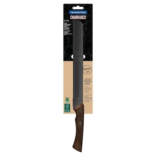 Faca Serrilhada Tramontina Churrasco Com Lâmina Em Aço Inox Escurecido E Cabo De Madeira 10 Polegada Faca Serrilhada Tramontina Churrasco com Lâmina em Aço Inox Escurecido e Cabo de Madeira 10 Ideal para cortar seu Brisket assado com precisão e perfeição para sua família e amigos, conte com a faca serrilhada Tramontina Churrasco com lâmina em aço inox escurecido e cabo de madeira 10 polegadas. Com excelente poder de corte e alta resistência, ela possui lâmina de aço inox escurecido e cabo de madeira fixado por rebites, o que a torna uma faca de robusta e de alta qualidade. Escolha Tramontina e garanta uma experiência incrível na hora de fazer seu churrasco!