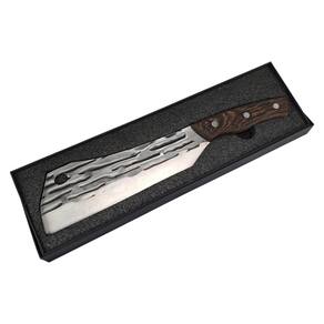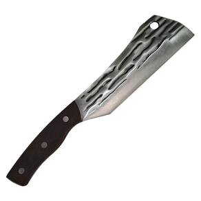 A faca possui um cabo de madeira e uma lâmina de aço inoxidável com marcas decorativas. Essa faca é versátil e adequada para uma variedade de tarefas na cozinha. Com seu cabo confortável e lâmina afiada, ela proporciona um manuseio preciso e seguro.