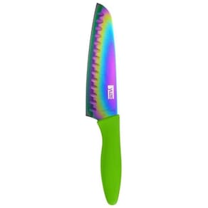 Faca Titanium Santoku 7 - Estojo Case Courinho Presente Veja a linda embalagem para presente, carregar ou impressionar, feita de material sintético preto e revestida com dimensões de 45 x 8 x 5 cm fechamento com zíper Modelo Santoku - Cortar, Picar, Fatiar Cabo soft touch Capa protetora para lamina Comprimento da lamina:17,8 cm Para manter as cores da lamina não lave com palhas de aço de qualquer espessura. Seque após lavar. Marca: Não Informado