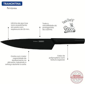 Características: Marca: Tramontina Código do Tramontina: 23684108 Linha: Nygma Cor: Preto Material: Aço inox Material do Cabo: Polipropileno Tamanho: 8 polegadas Aplicação: Faca Chef para corte de carnes, temperos e demais alimentos Compatível com Lava-louças: Não Ean: 7891112292543
