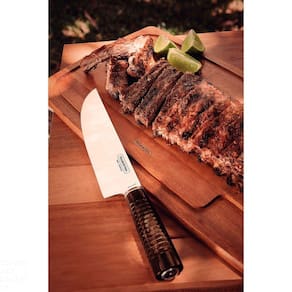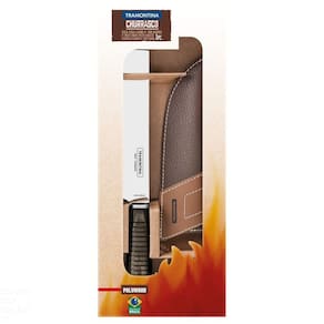 Para um bom apreciador de churrasco não pode faltar uma faca de qualidade, que proporcione cortes perfeitos. A Faca Tramontina para Carne 8 polegadas com Lâmina em Aço Inox e Cabo Castanho Polywood com Bainha de Couro oferece para qualquer ocasião funcionalidade e um design belíssimo. Produzida com lâmina em aço inox altamente durável, com cabo de madeira tratada Polywood resistente à impactos, altas temperaturas e com detalhes diferenciados, além de acompanhar uma bainha de couro que possibilita um armazenamento seguro da peça. Torne-se um grande mestre churrasqueiro com a linha Churrasco da Tramontina. Orientações A lâmina de aço inox têm maior durabilidade do fio devido ao tratamento térmico. O cabo de madeira tratada Polywood é resistentes à impactos e alta temperaturas garantindo maior resistência e durabilidade. A bainha em couro que oferece uma proteção ao fio da faca, permitindo o transporte e armazenagem com maior segurança. Pode ir à máquina de lavar louças facilitando seu dia a dia. Características Gerais EAN13 7891112128323 DUN14 17891112128320 NCM 8211.92.20 Peso Líquido 0,2650 kg. Peso Bruto 0,4150 kg. Metragem 0,002128 m³. Dimensões Embalagem (Compr. X Larg. X Alt.) 380x 160x 35 mm. Dimensões Produto (Compr. X Larg. X Alt.) 344x 56x 26 mm. Cor 1 4E3629 Hexa Observações Tenha cuidado ao manusear produto cortante e perfurante e mantenha-o fora do alcance das crianças. Para maior durabilidade do produto recomenda-se secar bem antes de guardar, mesmo após lavagem em máquina. Para descarte dos produtos e embalagens siga as orientações de reciclagem vigentes.