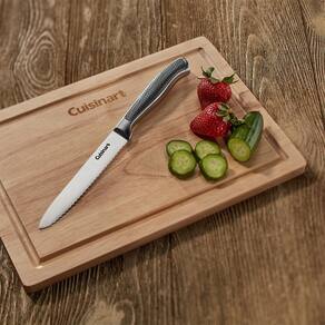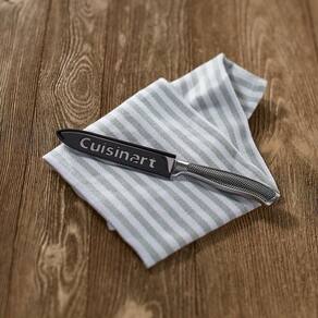 Marca: Cuisinart Modelo: C77SS-5SUT Cor: Prata Tipo: Faca utilitaria serrilhada Dimensoes: 6.99 X 2.24 X 35.56 cm Comprimento da lamina: 13 cm Material da lamina: Aco inox de alto carbono Tipo de fio: Serrilhado Material do cabo: Aco inox texturizado Indicacao de uso: Tomates, frutas, legumes, paes pequenos e alimentos com casca firme Acessorios: Capa protetora para lamina Garantia: 3 meses