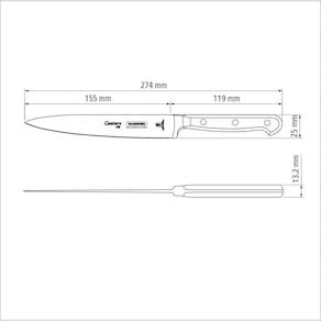 Faca Utility Tramontina Century com Lâmina em Aço Inox e Cabo de Policarbonato e Fibra de Vidro 6" A beleza e o sabor de um prato começa na escolha dos ingredientes e na sua preparação. Com a Faca Utility Tramontina Century com Lâmina em Aço Inox e Cabo de Policarbonato e Fibra de Vidro 6 polegadas ficará ainda mais simples de executar aquela receita incrível. A faca é da linha Century, traz o utensílio ideal para o uso intenso. Produzida com lâmina em aço inox, com cabo em policarbonato com fibra de vidro. Além disso, recebe tratamento térmico composto por têmpera (aquecimento da lâmina), sub-zero (resfriamento de -50° C a -196° C ) e revenimento (aumento da flexibilidade do aço especial), proporcionando vida longa da lâmina. Para tornar o manuseio ainda mais seguro e confortável, o cabo é anatômico e ergonômico. A Faca Tramontina para Cozinha reúne todas as características essenciais para proporcionar um dia a dia mais prazeroso na cozinha, além de funcional e prático. Informações Gerais Com ponta em formato de espada, auxilia na abertura e na perfuração dos alimentos. A lâmina forjada de aço inox especial garante um fio com maior durabilidade e precisão. A lâmina possui tratamento térmico diferenciado, composto por têmpera, sub-zero e revenimento. E conta com dureza da lâmina de 55 e 58 HRC, que garante maior resistência do fio e precisão no corte. O cabo de policarbonato reforçado com fibra de vidro garante alta durabilidade, equilíbrio e segurança. O cabo ergonômico proporciona maior segurança, equilíbrio e conforto na hora do corte. Pode ir à máquina de lavar louças facilitando seu dia a dia.