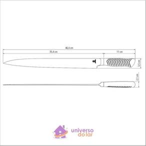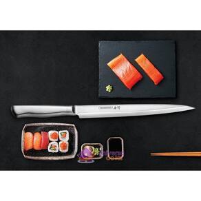 Faca Yanagiba Tramontina Sushi Diamond com Lâmina e Cabo em Aço Inox 13" Leve o sabor e bom gosto da culinária oriental para dentro da sua casa. Com a Faca Yanagiba Tramontina Sushi Diamond com Lâmina e Cabo em Aço Inox 13 Polegadas, preparar sushi e sashimi será ainda mais fácil. Com 13 polegadas, ela é uma faca com lâmina alongada de aço inox de alta performance. Possui fio especial que garante cortes precisos. Além disso, as ranhuras presentes no cabo da peça possibilitam total firmeza e segurança durante o uso. O cabo de aço inox é fácil de limpar e super-resistente. Um modelo clássico da culinária para você se aventurar na cozinha. Informações Gerais Modelo clássico da cozinha oriental, com lâmina alongada que garante cortes de precisão. Indispensável no preparo de sushi e sashimi. Cabo e lâmina de aço inox de alta performance com fio especial para cortes precisos. O cabo ergonômico proporciona maior segurança, equilíbrio e conforto na hora do corte. Recomendações de Uso Antes da primeira utilização, lave bem a peça e seque-a. Produto cortante e perfurante: tenha cuidado ao manusear e mantenha fora do alcance das crianças. Para maior durabilidade do produto recomenda-se secar bem antes de guardar, mesmo após lavagem em máquina. Recomenda-se o uso de tábuas de polipropileno ou madeira da Tramontina para maior durabilidade do fio da faca. Não é indicado o uso da faca para o corte de alimentos congelados. Mantenha sempre sua faca afiada utilizando os afiadores da Tramontina. Para descarte dos produtos e embalagens siga as orientações de reciclagem vigentes..