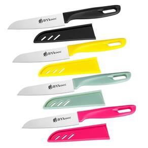 -?O que você ganha?- 1 peça de faca de descascar preta, 1 peça de faca de descascar amarela, 1 peça de faca verde, 1 peça de faca vermelha, 4 bainhas de faca combinadas. O conjunto de facas de descascar pode ser visto como o presente perfeito para todos os amigos, familiares e chefs profissionais.