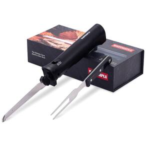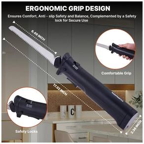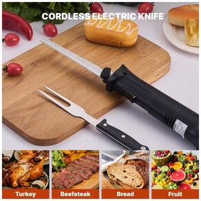 Faca elétrica sem fio Wanvoapls com lâmina de aço inoxidável serrilhada e garfo, ideal para cortar carnes, pães e queijos. Possui trava de segurança, design ergonômico e estojo para armazenamento.Vendido e entregue por Ecletiq