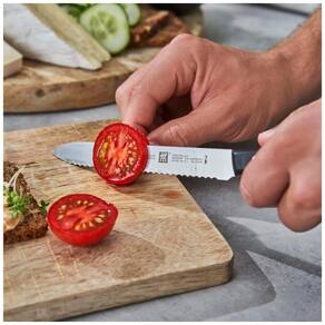 As facas TWIN Signature da ZWILLING são fabricadas em aço inoxidável alemão de fórmula especial, resultando em facas mais leves que não comprometem a afiação. Com a técnica exclusiva de endurecimento a frio da ZWILLING, as lâminas FRIODUR tornam-se mais duras, mais afiadas, não mancham ou lascam, mantendo-se afiadas por mais tempo. Para garantir um ângulo de corte ideal, a borda afiada a laser é finalizada manualmente pelos melhores artesãos. O cabo trirrivete embutido com o logotipo da ZWILLING oferece máxima durabilidade. As facas ZWILLING são ultra afiadas desde o início e mantêm a afiação por mais tempo, mesmo com cuidados mínimos. Com dureza Rockwell de 57, garantem excelente retenção de borda. Ângulo de 15 graus por lado. Construídas para durar, as facas ZWILLING são um investimento sólido, com mais de 300 anos de experiência em produção de facas. Com fabricação própria na Alemanha, garantimos qualidade em todas as etapas de produção. A lâmina em aço inoxidável alemão de fórmula especial, endurecida a frio, proporciona maior durabilidade, afiação duradoura e resistência superior. A faca ZWILLING é ergonomicamente projetada para máximo conforto ao preparar refeições, proporcionando um corte preciso e equilibrado.