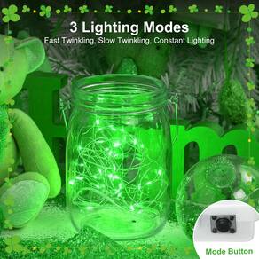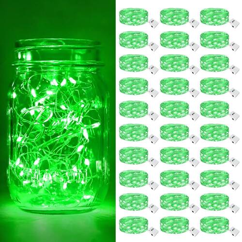 Btfarm Pacote com 30 luzes de fadas do dia de São Patrício operadas por bateria [3 modos], 2,1 m, 20 luzes de LED verdes cintilantes, à prova d'água, pequeno fio prateado para potes de pedreiro, decoração de festa de casamento - 3 baterias LR44 de alta capacidade: cada luz de fada está equipada com 3 baterias pré-instaladas de 180 mAh, não há necessidade de comprar extra, oferecendo iluminação de até 72 horas de duração. Perfeito para decorar potes de pedreiro, vasos, artesanato, garrafas, plantas, ornamentos, guirlandas, guirlandas e muito mais - Pacote com 30 unidades de ótimo custo-benefício: Feito de fio de prata de 1,8 m de alta qualidade, flexível e durável, facilmente enrolado em qualquer coisa. Possui 20 mini luzes LED que emitem um brilho suave e verde, parecem um país das maravilhas, criando um ambiente aconchegante e romântico - 3 modos de iluminação: ofertas de luzes cintilantes de fadas: piscando rápido, piscando lento e iluminação constante. Cada um fornece um efeito decorativo e ambiente distintos, atendendo às suas várias necessidades de ocasião. Um interruptor de pressão é projetado na lateral para ligar/desligar e alternar os modos - IP65 impermeável e seguro de usar: o cordão de luz suporta IP65 à prova d'água, pode ser submersível em água (a caixa de bateria não é à prova d'água). Alimentado por uma baixa tensão segura de 1,5 V, e não aquece ou causa curto-circuito mesmo após um longo uso, seguro de toque e uso - Iluminação decorativa fantástica: ideal para festa irlandesa do dia de São Patrício, dia de Ação de Graças, Halloween, Natal, aniversário de casamento, jardim interno, porta da frente, varanda, festa, tampo de mesa, cornija, quarto, janelas, quintal, árvore, plantas, paredes e muito mais!