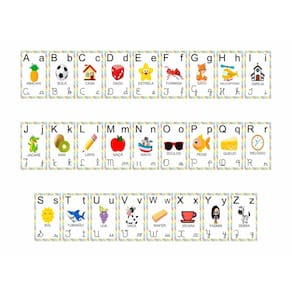 - A faixa do alfabeto é bem colorido e além de ajudar no ensino, ajuda a decorar de uma maneira muito divertida. Em 10 minutos já fica tudo pronto pois é muito fácil de aplicar.