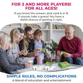 Aviso: Não adequado para crianças menores de 3 anos de idade. QUOKKA Who Knows Science Better? Jogos de Aprendizagem de Família para Crianças de 5 a 7 anos. Jogos de cartas para a família para crianças e adultos centrados na ciência oferecem uma maneira divertida e inclusiva para várias gerações se reunirem e desfrutarem de tempo de qualidade. Jogos de tabuleiro educativos divertidos, independentemente da idade ou origem. Os cartões de teste de ciência são projetados para apresentar conceitos complexos em um formato simplificado e acessível. Através da mecânica de jogo intuitiva, os jogadores podem entender ideias científicas fundamentais sem se sentirem sobrecarregados. Os jogos de cartas para as famílias brincarem juntas proporcionam uma experiência de aprendizado multidimensional integrando vários tópicos científicos ao jogo. Da biologia à astronomia, os jogadores podem explorar uma ampla ampla variedade de assuntos. Os jogos de festa baseados na ciência para a família introduzem um elemento de competição amigável que motiva os jogadores a absorver conhecimento e aplicar habilidades de pensamento crítico, tornando o aprendizado um processo agradável e gratificante. - Entretenimento inclusivo: jogos de cartas para a família para crianças e adultos centrados na ciência oferecem uma maneira divertida e inclusiva para várias gerações se reunirem e desfrutarem de tempo de qualidade; jogos de tabuleiro educativos divertidos, independentemente da idade ou formação - Jogo de ciência: cartas de teste de ciências e jogos familiares de aprendizagem imersiva para crianças, amplifica o conhecimento científico; os jogadores se aprofundam em biologia, física, química e muito mais, respondendo a perguntas, promovendo uma compreensão profunda da ciência através do jogo - HORAS DE ENTRETENIMENTO: Este jogo de cartas de aprendizagem infantil inclui 500 perguntas divertidas – não há dois jogos iguais! Cada rodada de jogos de ciência dura 15 minutos - Competição amigável: jogos familiares baseados na ciência para crianças introduzem um elemento de competição amigável que motiva os jogadores a absorver conhecimento e aplicar habilidades de pensamento crítico, tornando o aprendizado um processo agradável e gratificante - Ligação e comunicação: participar de jogos de tabuleiro focados na ciência para crianças a partir de 5 anos promove a comunicação aberta e fortalece os laços familiares; os jogadores discutem, compartilham e trocam informações sobre os conceitos científicos incorporados no jogo