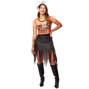 Seja a bruxa mais estilosa da festa! Esse conjunto com cropped estampado e saia assimétrica traz um visual moderno e divertido para arrasar no Halloween.