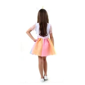 A saia em cores degrada completa ou visual, proporcionando um efeito mágico e colorido que reflete a magia dos unicórnios.