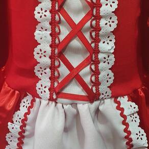 Fantassia confeccionada em malha helanca e cetim com acabamanto em fitas e passamanaria.