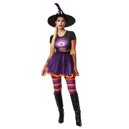 Para um toque adicional de extravagância bruxa, a fantasia inclui uma calça listrada que complementa o conjunto com um toque de ousadia.