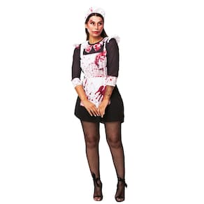 Vestido Curto: O vestido curto é preto, com mangas compridas e colarinhos brancos, trazendo um contraste clássico e sinistro. A frente do vestido possui um avental branco com manchas vermelhas simulando sangue, adicionando um toque de horror ao traje.