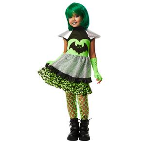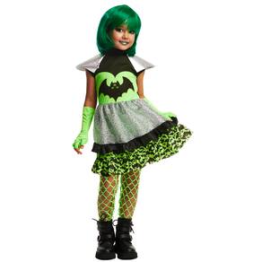 Saia em Camadas: A saia é composta por duas camadas, uma verde com pequenas estampas de morceguinhos, e outra prata com babado preto na barra, criando um visual único e encantador.