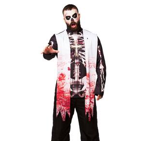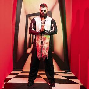 Características da Fantasia: Camisa : A camisa preta de manga longa apresenta uma estampa de caveira e um crucifixo no peito, adicionando um toque macabro ao traje. A fantasia acompanha uma estola, completando o visual temático de um exorcista do mal. Calça Preta: Acompanha uma calça preta, garantindo um conjunto completo e assustador.