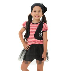 O pirata menina é a versão feminina do pirata, para meninas corajosas e aventureiras. Um conjunto de shorts balonê, camisetinha de mangas curtas com serigrafia e bandana com serigrafia. Para facilitar a colocação, a gola é em ribana. A malha é 100% algodão, tão confortável que as crianças não precisam tirá-la nem para dormir. Para completar a brincadeira, tem um tapa olho em feltro como acessório. Marca: FÁBRICA DE SONHOS