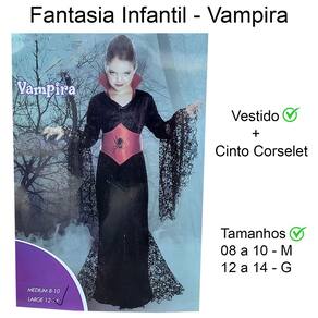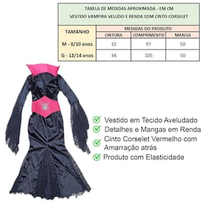 Fantasia Infantil Vampira Halloween Vestido Teia Aranha + Cinto Corselet. Vestido modelo Espartilho preto com detalhes em vermelho. Possui: Mangas compridas em forma de teia, vestido em tecido veludo brilhante na cor preto e detalhes em renda preta, gola alta vermelha, cinto faixa vermelho decorado com aranha e amarração atrás modelo corselet. Disponível em dois tamanhos: M indicado para 8/10 anos - G indicado para 12/14 anos. Verifique tabela de medidas anexa às fotos. Produto com elasticidade. Produto: 100% poliéster. Atenção: Produto de alto giro. Recebemos novas remessas semanalmente e algum detalhe pode variar conforme o lote recebido, porém o produto é o mesmo e mantém as mesmas características e qualidade. Contém: 1 vestido na numeração selecionada - O vestido acompanha cinto. Fotos ilustrativas e reais do produto.