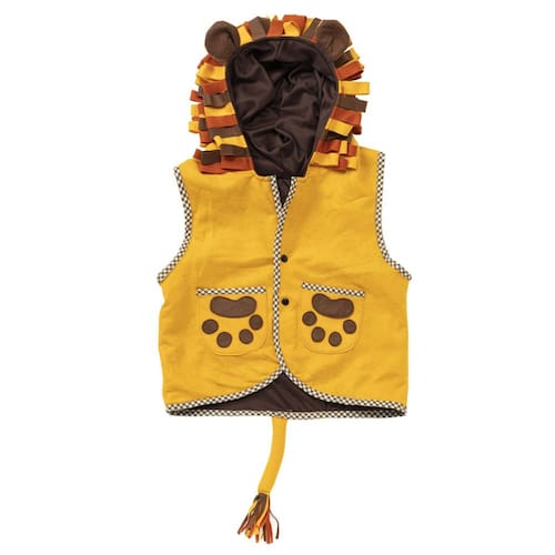 Confeccionado em feltro e forro de cetim, o colete tem capuz com uma linda juba colorida e orelhas, bolsos frontais em forma de patas e rabo pendurado. É diversão na certa. Tamanho único: Serve para crianças de até 8 anos. Medidas altura x largura : 49cm x 43cm. Ficha técnica: Material: Feltro, cetim, com viés xadrez. Apliques bordados. Capuz: sim Orelhas: sim Bolsos: sim Fechamento por botão . Marca: Não Informado Ean: 7898661051713