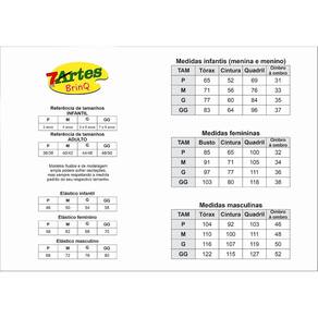 P: 3 anos (Tórax 65 cm | Cintura 52 cm | Quadril 69 cm | Ombro a Ombro 31 cm) M: 4 anos (Tórax 71 cm | Cintura 56 cm | Quadril 76 cm | Ombro a Ombro 33 cm) G: 5 e 6 anos (Tórax 77 cm | Cintura 60 cm | Quadril 84 cm | Ombro a Ombro 35 cm) GG: 7 e 8 anos (Tórax 83 cm | Cintura 64 cm | Quadril 96 cm | Ombro a Ombro 37 cm)