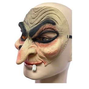 A Meia Máscara Bruxa cobre a metade do rosto e é presa atrás da cabeça com um elástico, é enrugada, tem umas verrugas, características próprias das bruxas malvadas.