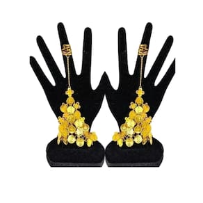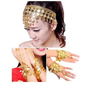 Conteudo: 2 Pulseiras Odalisca + 1 Tiara Testeira com as seguintes características: Cor: Dourada Material: Latão Fino/Metal Modelo: Pulseira com Anel