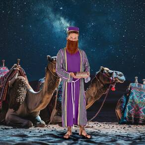 - Vestido chique masculino: basta adicionar ouro, incenso ou mirra à nossa fantasia roxa de Homem Sábio, perfeita para qualquer presépio!