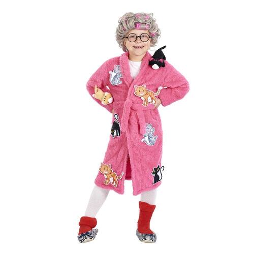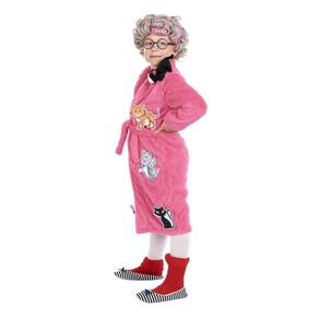 - A fantasia inclui: roupão rosa de manga comprida, com detalhes de gato estampados anexados. Também inclui peruca de fantasia cinza, com rolos rosa anexados e óculos pretos emoldurados.