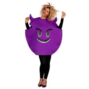 - O traje inclui: túnica redonda roxa com orifícios para cabeça e braços, com chifres e estampa facial com emoji na frente.