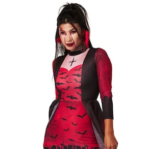 A Fantasia Rainha Vampira apresenta um vestido curto vermelho com uma estampa de morcegos, garantindo um visual sombrio e encantador para a noite de Halloween.