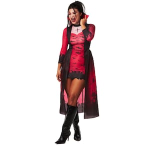 O vestido vem com uma calda longa, adicionando um toque majestoso e misterioso ao seu visual de Rainha Vampira. O vestido possui mangas 3/4 e uma gola alta, conferindo um toque elegante e sedutor ao traje.