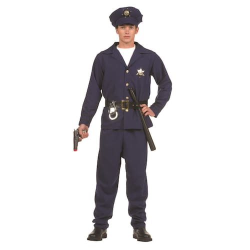 policeman- azul escuro jaqueta com botões, azul, calça, chapéu, cinto de vinil preto e emblemas – poli-poplina tecida
