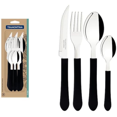 Toda a tradição e qualidade Tramontina, nos momentos mais gostosos à mesa, com o Faqueiro 23198/039 da linha Leme composto por 12 peças, sendo 3 facas, 3 garfos, 3 colheres e 3 colheres para chá. Todo o material pode ser levado à máquina de lavar louças. As facas possuem tratamento térmico, portanto maior durabilidade; os garfos, colheres e colheres para chá têm espessura de aço e estampagem nas lâminas, o que garante maior resistência aos produtos, evitando deformações. Os cabos são de polipropileno, mais resistentes e duráveis.