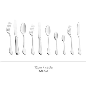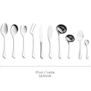 Contém: 12 Facas Mesa ,12 Garfos Mesa ,12 Colheres Mesa ,12 Facas Sobremesa ,12 Garfos Sobremesa ,12 Colheres Sobremesa ,12 Colheres Chá ,12 Colheres Café ,1 Garfo Salada ,1 Colher Salada ,1 Concha Sopa ,1 Colher P/Servir ,1 Colher Açúcar ,1 Garfo Servir Peixe ,12 Facas Peixe, 12 Garfos Peixe,1 Espátula Servir Peixe ,1 Concha Molho,1 Faca Assado,1 Garfo Assado.
