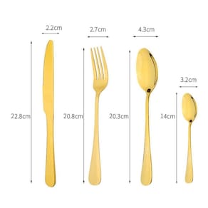 O kit é composto de 6 garfo, 6 faca e 6 colheres de sopa e 6 colheres sobremesa em aço inox dourado, e 1 suporte em aço inox cor (Dourado).