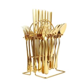 Kit de talheres com 24pçs Inox Dourado com Brilho e Suporte.Ideal para te acompanhar na rotina e receber seus convidados em casa. O kit é composto de 6 garfo, 6 faca e 6 colheres de sopa e 6 colheres sobremesa em aço inox dourado, e 1 suporte em aço inox cor (Dourado).Medidas ; Garfo 20cm x 2,4cm x 2mm / Faca 22cm x 2cm x 2mm / Colher Mesa 20cm x 4,4cm x 2mm.Colher Cha/Sobremesa 14cm x 3cm x 2mm. Suporte de talheres 24cm x 13cm x 15cm.Uma combinação de design, resistência e qualidade. Uma escolha certa para recusar os talheres descartáveis de forma prática e estilosa. Os talheres são composto e produzidas em aço inox com banho especial que proporciona acabamento impecável e uma excelente apresentação. Cada talher medi uma media de 20cm tamanho normal para refeiçoes tirando de sobremesa que e menor. Embalado em plastico bolha e caixa.Todas as informações divulgadas são de responsabilidade do Fabricante/Fornecedor.A garantia contra defeitos de fabricação,não cobre defeitos originados por mau uso.