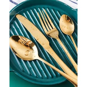 Faqueiro 24 Peças Aço Inox Kyoto Dourado/ Com o faqueiro Positano dourado e suas peças finas e elegantes deixe a sua mesa posta ainda mais charmosa e elegante, a linha de faqueiros da lyor decora sua mesa e serve bem seus convidados. Composição: 06 Garfos De Mesa 06 Colheres De Mesa 06 Facas De Mesa 06 Colheres De Chá Nome da marca: Lyor Fabricante: lyor Modelo: 1330 Cor: dourado Tamanho: Faca churrasco 3mm - 22,4cm Garfos mesa - 2mm - 20cm Colher mesa 2mm - 18,8cm Colher sobremesa 1,2mm - 12,7cm Número de unidades: 24 peças Marca: Não Informado