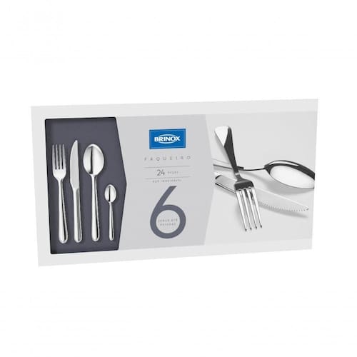 Faqueiro 24 Peças - Bellagio - Brinox O design suave e as linhas contínuas da linha Bellagio, com o mix de produtos completo para mesa e servir, oferecem beleza e cuidado para todas as refeições. A estrutura e os cabos em aço inox polido tornam as peças altamente durável e resistente, não correndo risco de oxidar e podendo inclusive ir á máquina de lavar louça. Na versão com 24 peças, o conjunto de talheres contém os utensílios básicos de uma mesa para seis pessoas: garfos e colheres de mesa, facas de churrasco e colheres de chá.Polimento extra brilhoColheres de chá e café com acabamento vibradoEspessura: 3 mm da facaEspessura: 1,5 mm do garfo e colher Material - Aço Inox Linha - Bellagio Composição - 06 Colher de mesa06 Garfo de mesa06 Colher de chá06 Faca de churrasco Garantia - 90 dias para vícios ou defeitos de fabricação. Conteúdo Especial -