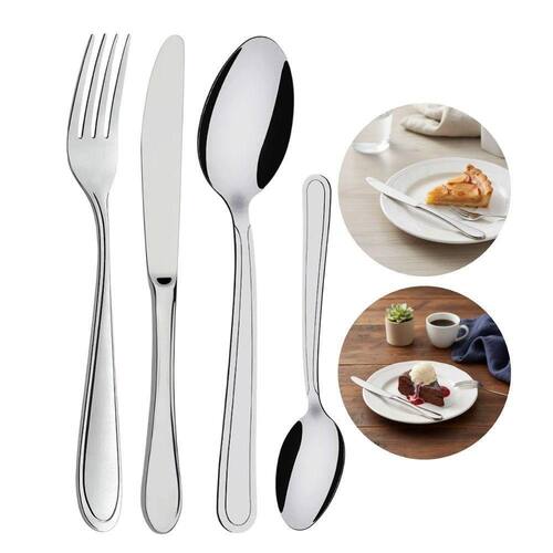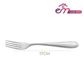 Composto por seis garfos, seis colheres e seis facas de sobremesa, este conjunto é fabricado em aço inoxidável, material que oferece resistência à corrosão e facilita a higienização, mantendo a superfície sem alterações mesmo após uso frequente. Cada garfo possui 17 cm de comprimento, dimensão adequada para o manuseio de porções menores de sobremesas, proporcionando equilíbrio e firmeza durante o uso.