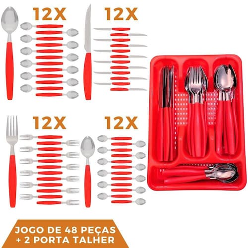 Conj de talheres + porta talher O Conjunto de talheres com porta talher é um conjunto de utensílios de mesa composto por talheres básicos, como garfos, facas, colheres e colheres de chá, acompanhados de um prático porta talheres para armazenamento e transporte conveniente. Esse conjunto é ideal para uso em casa, em viagens, acampamentos, piqueniques e outras ocasiões em que seja necessário levar os talheres consigo. Os talheres são compostos por aço inoxidável de alta qualidade e um porta talher feito de plástico durável. Os talheres são fabricados em aço inoxidável, um material conhecido por sua resistência à corrosão e durabilidade. Eles são projetados para serem resistentes e duráveis, permitindo o uso contínuo sem enferrujar ou corroer, mesmo com o contato frequente com alimentos e água.