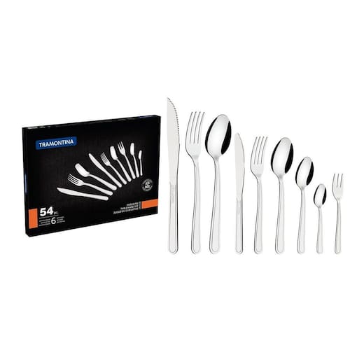 Faqueiro 54 Pcs Buzios - Aço Inox 23799077 Lâminas e cabos em aço inox. Conteúdo 6 -Facas para churrasco 4 6 - Garfos de mesa 6 - Colheres de mesa 6 - Facas para sobremesa 3 6 - Garfos para sobremesa 6 - Colheres para sobremesa 6 - Colheres para chá 6 - Colheres para café 6 - Garfos para torta Orientações Gerais Uso seguro e adequado: Tenha cuidado ao manusear produtos cortantes e perfurantes e mantenha-os fora do alcance de crianças. Para garantir a durabilidade dos produtos, recomenda-se secá-los bem após a lavagem, mesmo sendo em máquina de lavar louças.