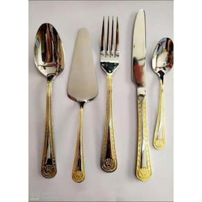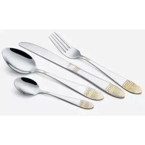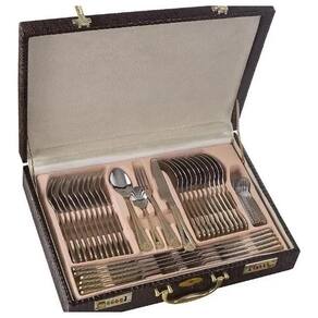 Faqueiro 84Peças em Aço Inoxidável 18/10 3.0mm de espessura com filetes banhando a ouro 24k, design exclusivo e sofisticado. Faqueiro leva charme, elegância e bom gosto para a composição da sua mesa. Um faqueiro clássico produzido em aço inox, ricamente adornado e exclusivo. Todas as peças são produzidas em aço inoxidável. Apresentam espessura de 3mm e acabamento espelhado. Caixa produzida em courino, estilo maleta reforçada com fechamento em sistema de código. Inclui 12 Colheres 12 Garfos principais 12 Facas principais 12 Garfos sobremesa 12 Colheres sobremesa 12 colheres café 01 Espátula pata bolo 02 Garfos peixe 01 Concha grande 01 Concha pequena 01 Colher açucareiro 01 Pegador 02 Colheres para servir 02 Colheres de salada 01 Maleta