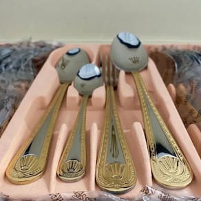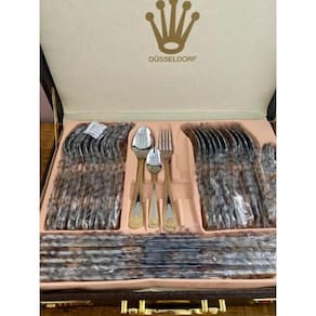 Faqueiro 84 Peças Designer Alemão 24K Faqueiro Aço Cirugico Luxo 84 Peças Dourado com Maleta Peças em Aço cirugico Inoxidável 18/10 3.0mm de espessura com filetes dourados ouro 24k, design exclusivo e sofisticado Faqueiro leva charme, elegância e bom gosto para a composição da sua mesa. Um faqueiro clássico produzido em aço inox, ricamente adornado e exclusivo. Todas as peças são produzidas em aço inoxidável. Apresentam espessura de 3mm e acabamento espelhado. Caixa produzida no estilo maleta reforçada com fechamento em sistema de código. 01 Maleta com: 12 Colheres 12 Garfos principais 12 Facas principais 12 colheres chá/sobremesa 12 Garfos sobremesa 01 Espátula pata bolo 02 Garfos peixe 01 Concha grande 01 Concha pequena 01 Colher açucareiro 01 Pegador 02 Colheres para servir 02 Colheres de salada Garantia 1 ano.