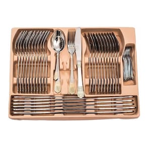 Faqueiro 84 Peças Designer Alemão 24K Faqueiro Aço Cirugico Luxo 84 Peças Dourado com Maleta Peças em Aço cirugico Inoxidável 18/10 3.0mm de espessura com filetes dourados ouro 24k, design exclusivo e sofisticado Faqueiro leva charme, elegância e bom gosto para a composição da sua mesa. Um faqueiro clássico produzido em aço inox, ricamente adornado e exclusivo. Todas as peças são produzidas em aço inoxidável. Apresentam espessura de 3mm e acabamento espelhado. Caixa produzida no estilo maleta reforçada com fechamento em sistema de código. 01 Maleta com: 12 Colheres 12 Garfos principais 12 Facas principais 12 colheres chá/sobremesa 12 Garfos sobremesa 01 Espátula pata bolo 02 Garfos peixe 01 Concha grande 01 Concha pequena 01 Colher açucareiro 01 Pegador 02 Colheres para servir 02 Colheres de salada Garantia 1 ano. Ean: 7909463143145