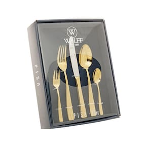 REQUINTADO, LUXUOSO E MODERNO, O FAQUEIRO AÇO INOX 30 PEÇAS DOURADO PISA WOLFF É O QUERIDINHO DO MOMENTO E TEM GANHADO ESPAÇO NAS MESAS DE JANTARES E DE EVENTOS. ELE TEM O PODER DE DEIXAR UMA COMPOSIÇÃO MAIS BONITA E RELUZENTE, COMBINANDO MUITO BEM COM QUALQUER ESTILO DE MESA POSTA.