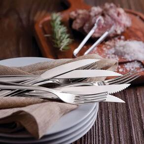 Garantia: 90 dias / Peso: 8,800kg / Cor predominante: inox / Ref: 7891116084168; Dimensão da embalagem: 43cm (C) x 61cm (L) x 33cm (A). Cuidados: - Para garantir a durabilidade dos produtos, recomenda-se secá-los bem após a lavagem, mesmo sendo em máquina de lavar louças; - Sempre que possível, use água quente, pois renova o brilho do talher. - Após a lavagem, enxugue imediatamente os talheres, caso contrário, as substâncias químicas da água (cloro) poderão causar manchas. - Evite atrito entre os talheres durante o processo de lavagem e no armazenamento, para mantê-los sem riscos. - Evite o contato das peças com superfícies quentes. Elas provocam a descoloração do produto. - Não guarde os talheres em locais úmidos. A umidade também provoca manchas. Materiais: polipropileno e aço inox. Conteúdo: - 6 facas para churrasco; - 6 colher para café; - 6 garfos para torta; - 6 garfos de mesa; - 6 colher de mesa; - 6 colher para chá.