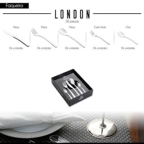 Ideal para as refeições diárias, o Faqueiro Wolff London é feito em aço inoxidável resistente e duradouro. Tem um design requintado com acabamento em alto brilho que tornam a ocasião ainda mais requintada. Faqueiro de uso diario, para quem não quer abrir mão da qualidade e requinte. Produtos especiais para servir em grande estilo Altura: 7,5cm Largura: 28,5cm Profundidade: 21,5cm Material: Aço Inox Cor: Prata Número de Itens: 30 Conteúdo Caixa contendo: 06 unidades de colheres, 06 unidades de Garfos, 06 unidades de facas, 06 unidades de garfos para Bolo e 06 unidades de colheres de chá. Ean: 7895730799927