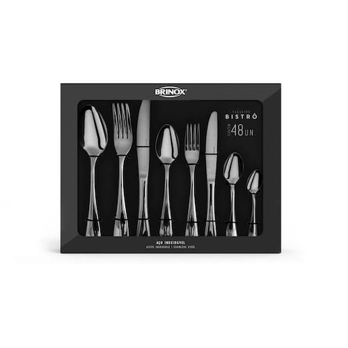 Faqueiro Bistrô 48 Peças Brinox O Faqueiro Bistrô 48 Peças da Brinox, serve refeições para até seis pessoas, contendo garfos e colheres de mesa, facas de mesa, colheres de café, colheres de chá, facas de sobremesa, garfos e colheres de sobremesa. São 48 peças com polimento extra brilho, que deixaram a sua cozinha muito mais bonita. Atributos do Produto: Referência: 5121/154 Código: 5121154 Código de Barras: 7896502823796 Cor: Prata : 3 Meses Marca: Brinox Linha: Bistrô Detalhes e Especificações Técnicas: Resistente Fácil de Limpar Dimensões da Embalagem: Altura: 4,5cm Largura: 47,0cm Comprimento: 51,5cm Peso: 3,36kg Conteúdo da Embalagem: 06 Colheres de Mesa 06 Garfos de Mesa 06 Facas de Mesa 06 Colheres de Sobremesa 06 Garfos de Sobremesa 06 Facas de Sobremesa 06 Colheres de café 06 Colheres de chá Importante Produtos de decoração não inclusos. Imagens meramente ilustrativas; As cores dos objetos podem sofrer alterações devido a luminosidade, configurações do monitor e até mesmo a percepção do usuário; Os dados divulgados são de responsabilidade do fabricante/fornecedor. Marca: Não Informado